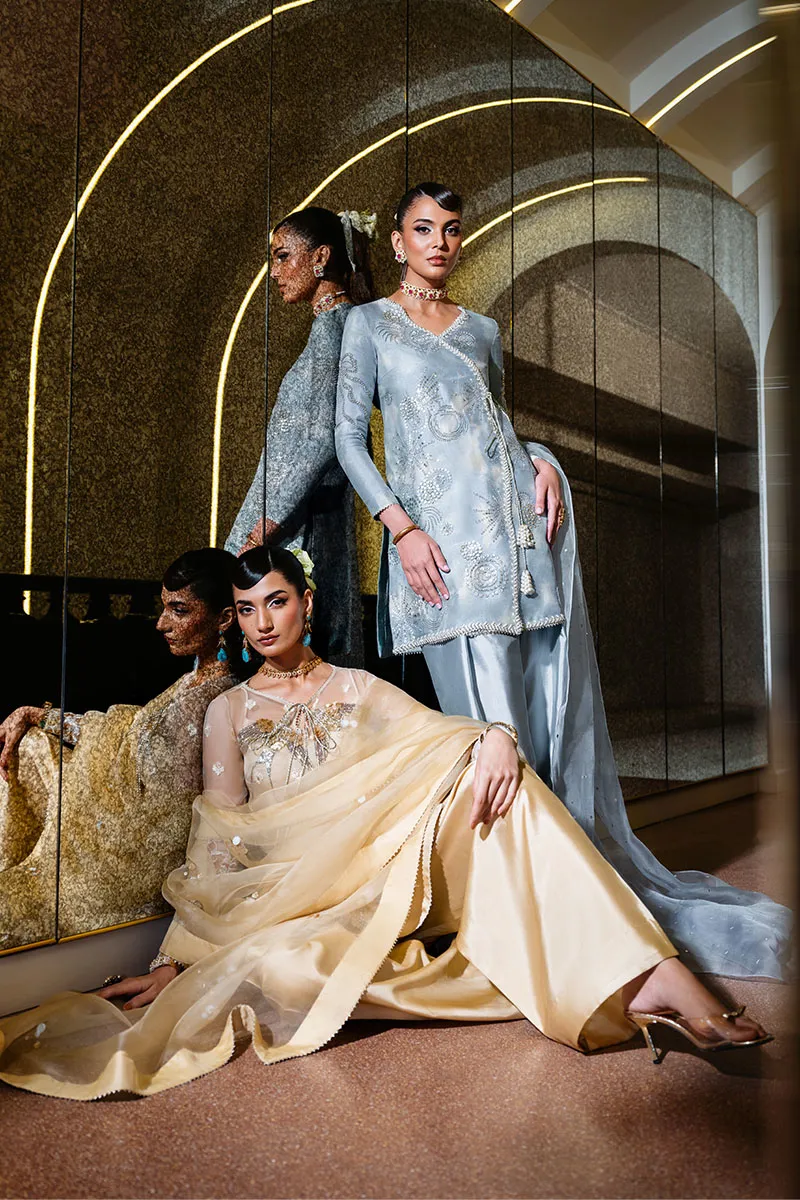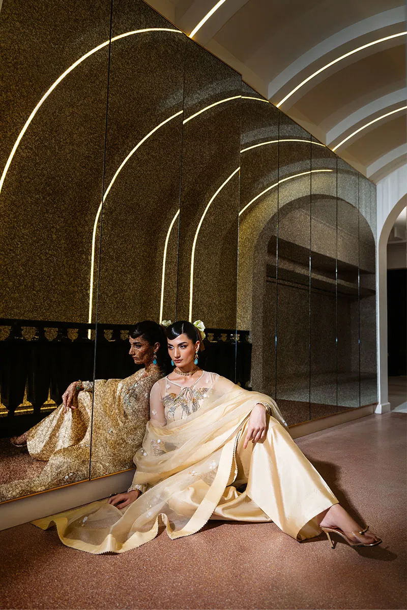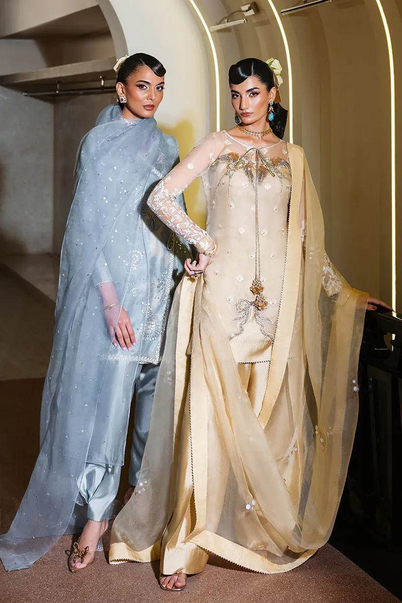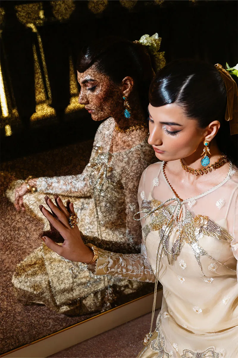 Includes: Shirt with Shalwar Bloomingdale – A soft beige ensemble featuring a mid-thigh organza shirt adorned with hand-embellished birds, dabka, naqshi, crystals, and sequins. Finished with a keyhole neckline and tassels, paired with a farshi shalwar in tissue silk and an organza dupatta detailed with lace and borders. Timeless elegance, redefined.