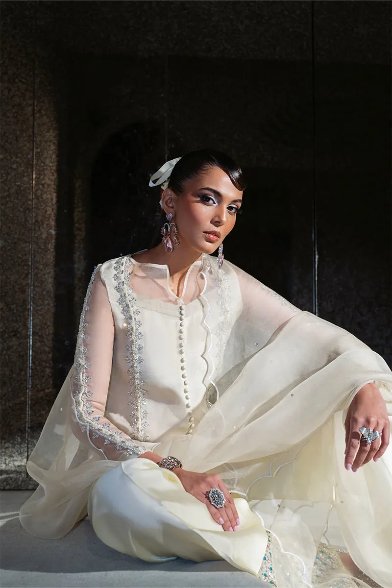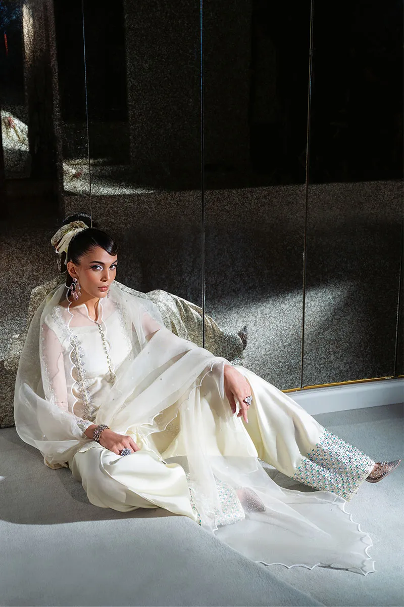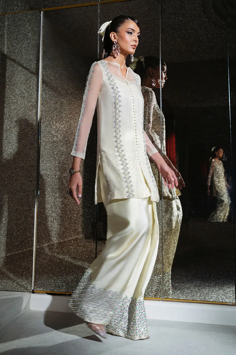 Includes: Shirt with Shalwar Cham Cham – in the softest shade of lemon, where every detail dazzles. The shirt is adorned with hand embellishments — crystals, sequins, stones, and Swarovski’s — finished with braid accents and loop button detailing. Paired with a delicately embellished shalwar and a scalloped organza dupatta dusted with sequin spray. Elegant. Playful. Unmissable.