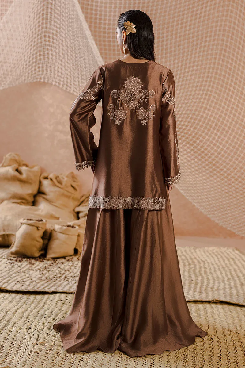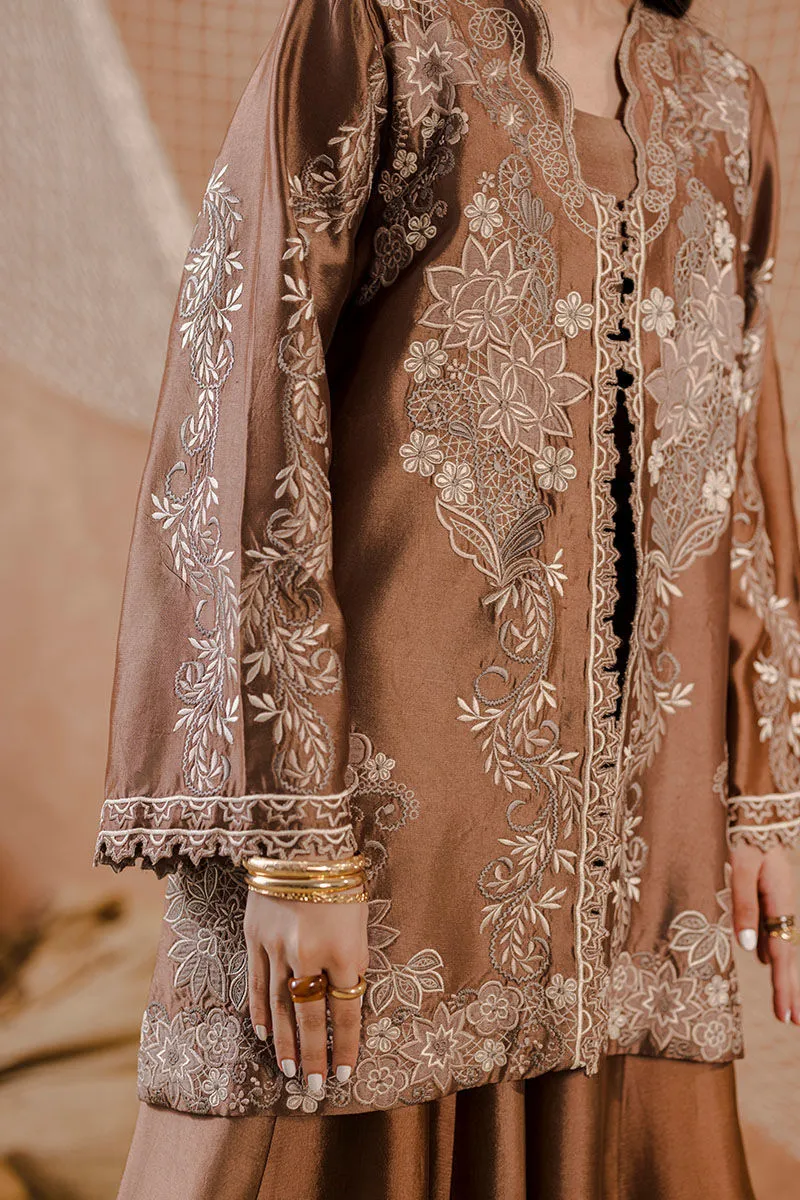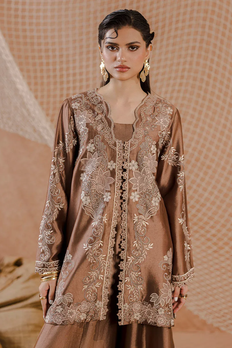 A short, front-open sheesha silk jacket paired with flared pants and a matching bandeau. Detailed with floral khaddi silk appliqué and cutwork for a textural finish.