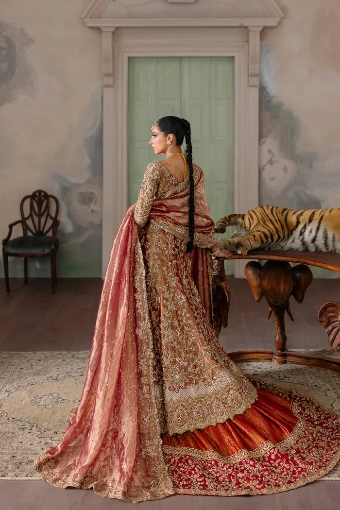The front-open pishwas, fashioned from ethereal burnt coral tissue, shimmer beautifully under delicate hand embellishments with rich zardozi and resham work.