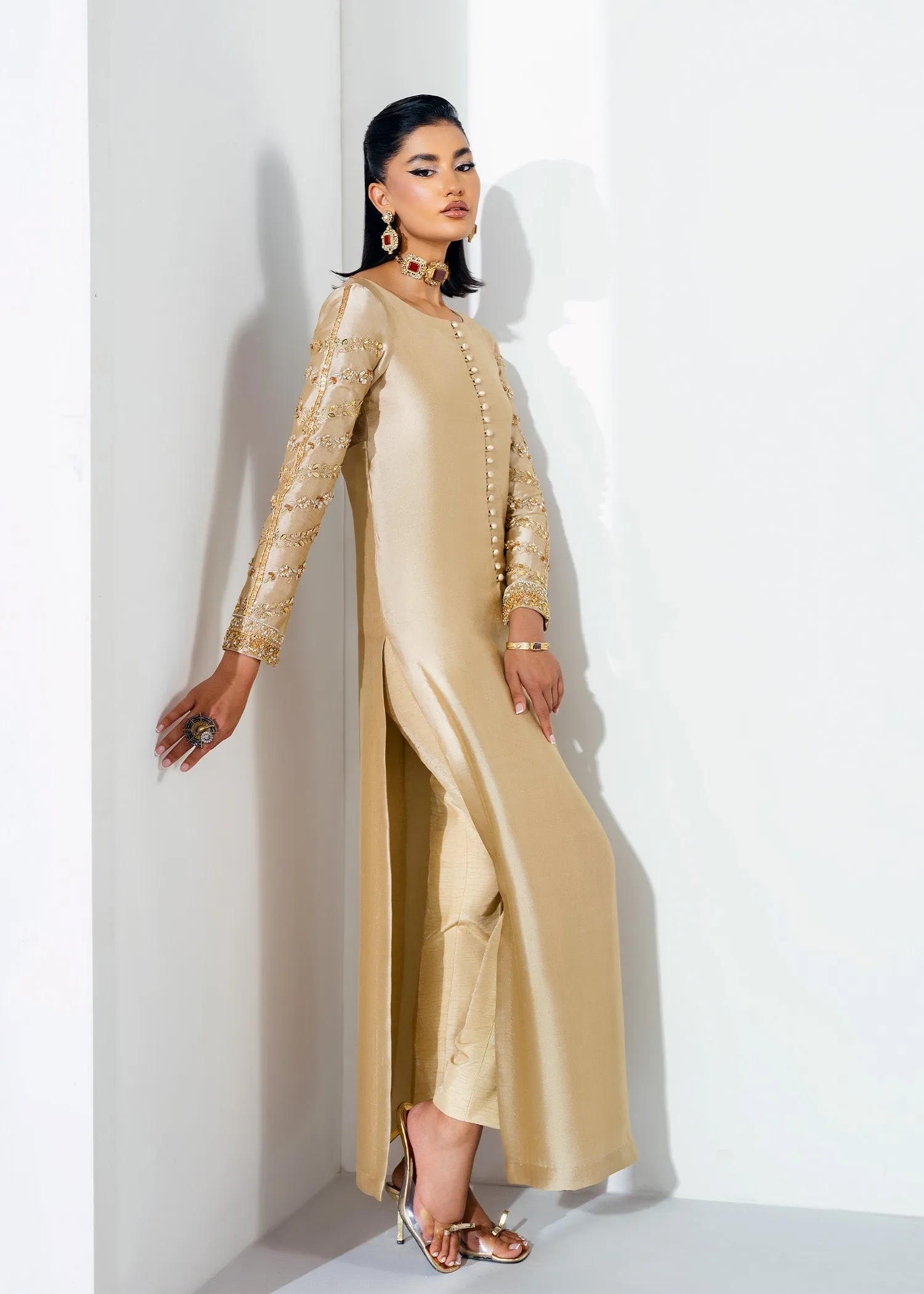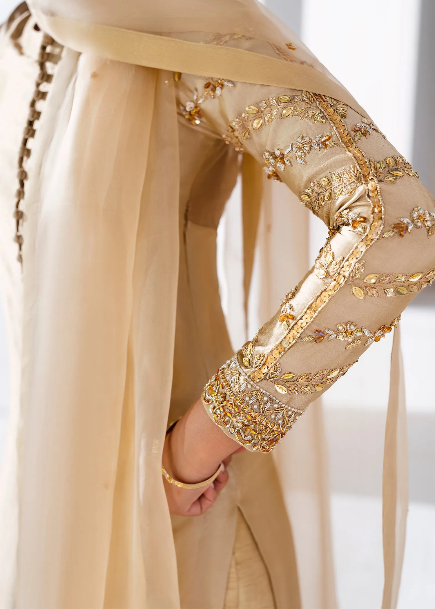 Radiate understated elegance with this 3-piece luxury pret outfit in a gold beige tone. The long shirt features a sleek design highlighted by loop buttons on the front and delicately embellished sleeves adorned with traditional handwork, reflecting timeless craftsmanship. Paired with straight pants for a clean, contemporary look, the ensemble strikes a perfect balance between tradition and modernity. The dupatta, with its embellished pallus, adds a graceful finishing touch, making it ideal for festive occasions, intimate gatherings, or formal events. *THE OUTFIT WILL COME WITH A COVERED PLAIN BACK.