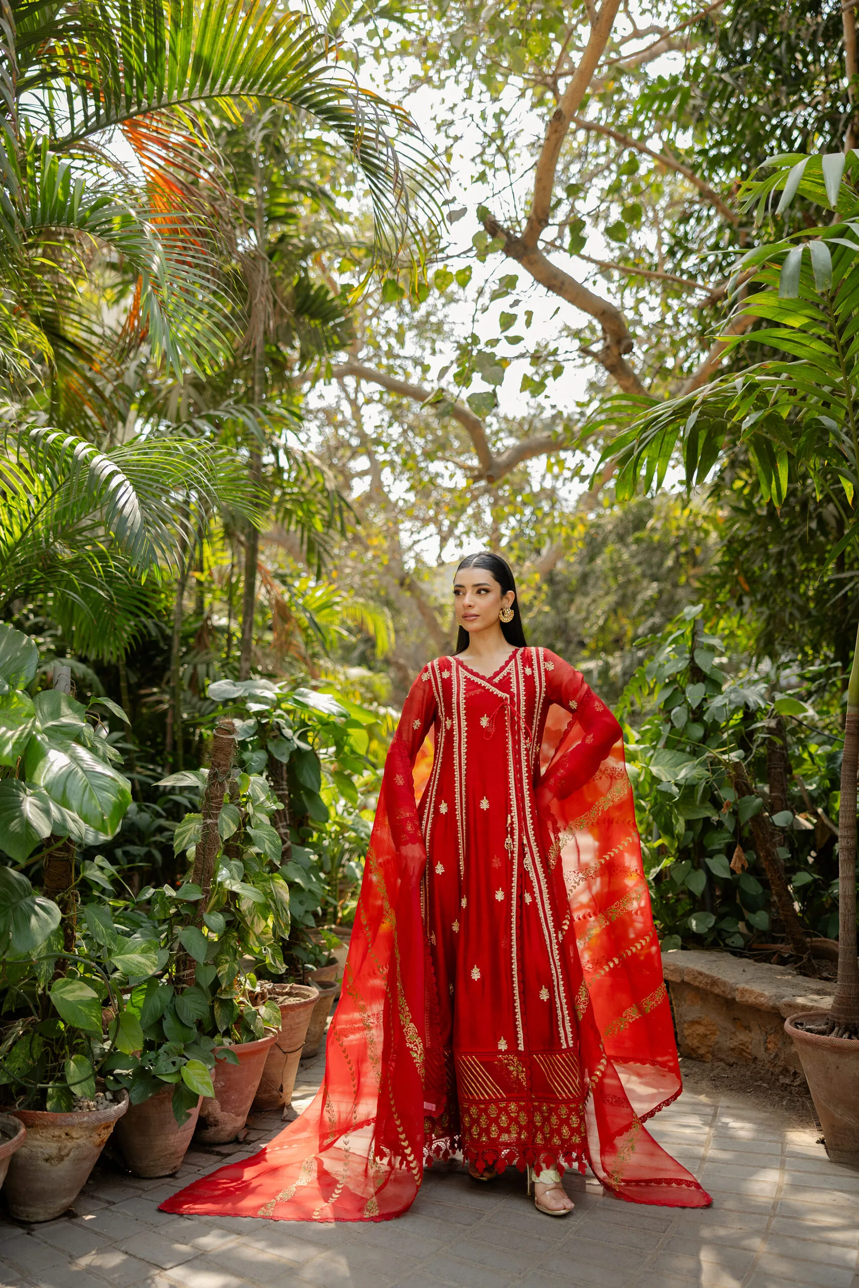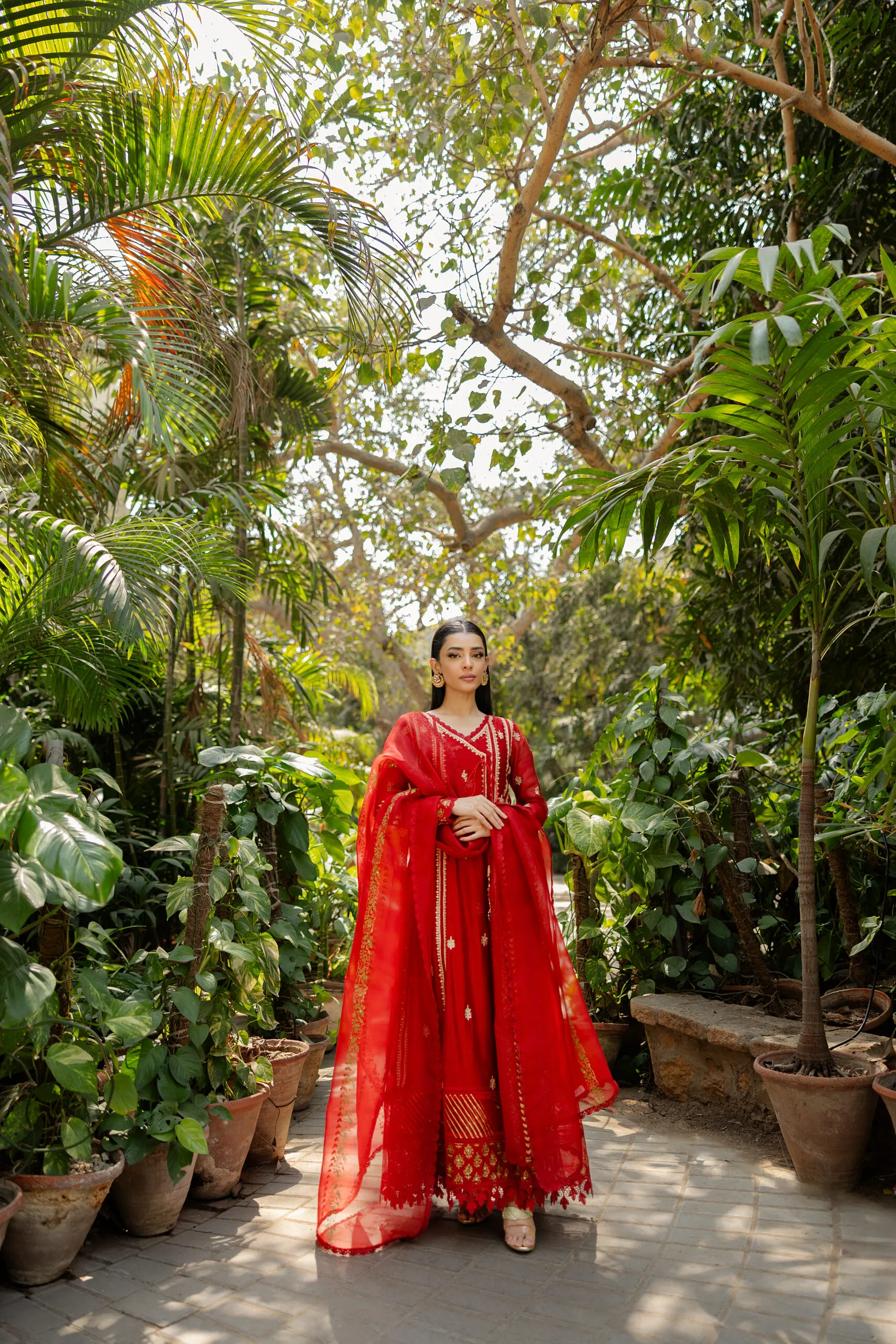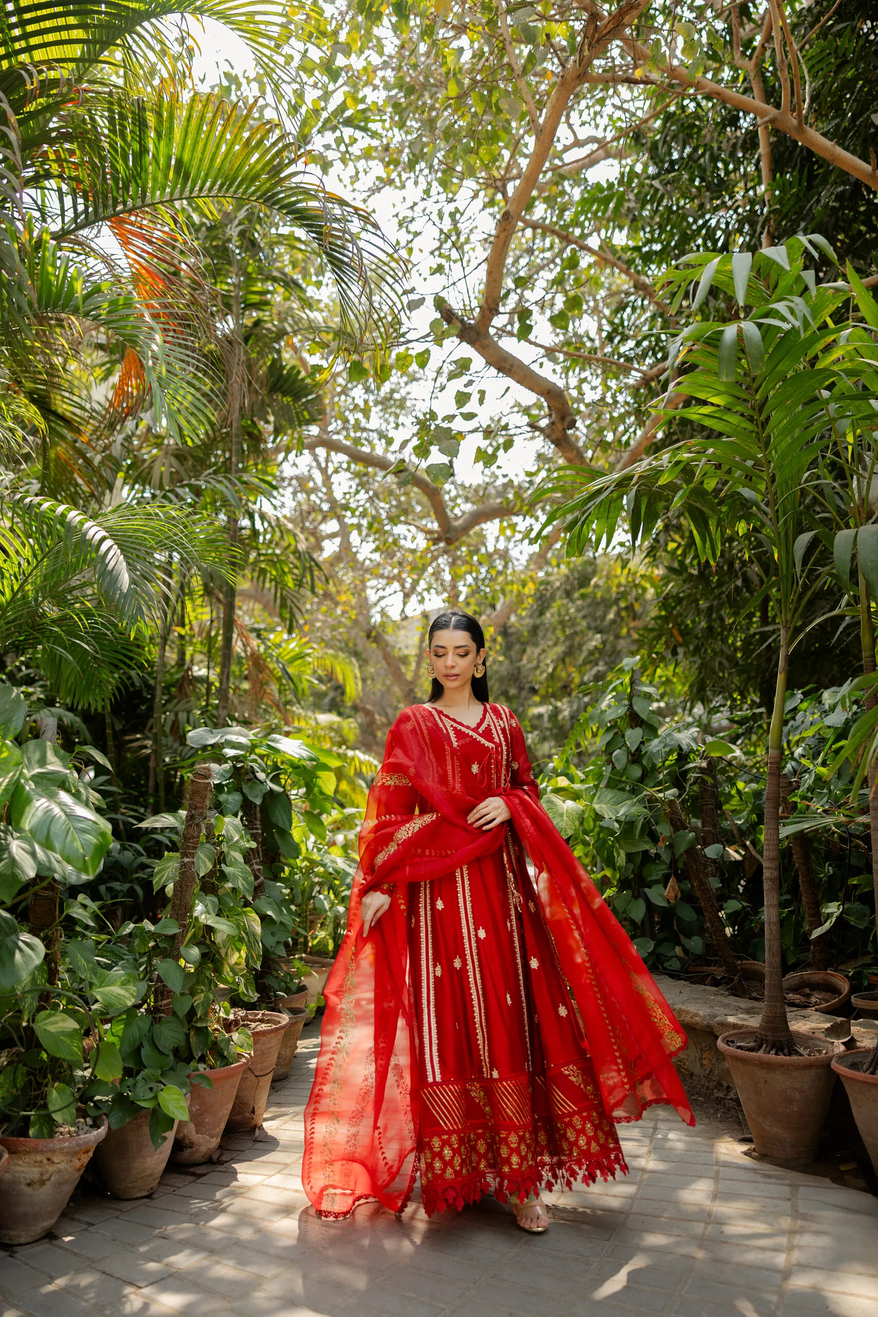 Red Anrakha khaddi net done with laces Ari work hand touching & block print