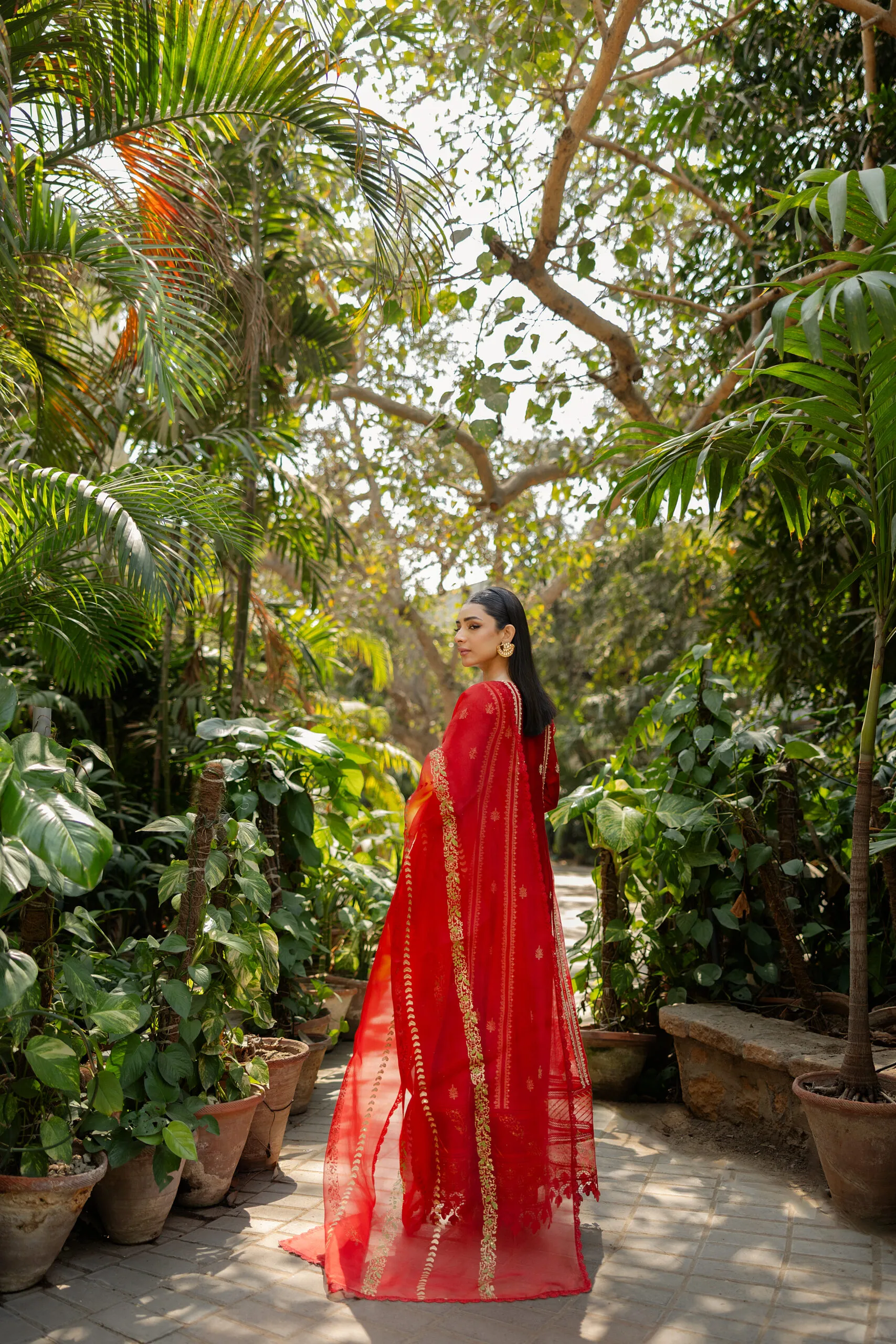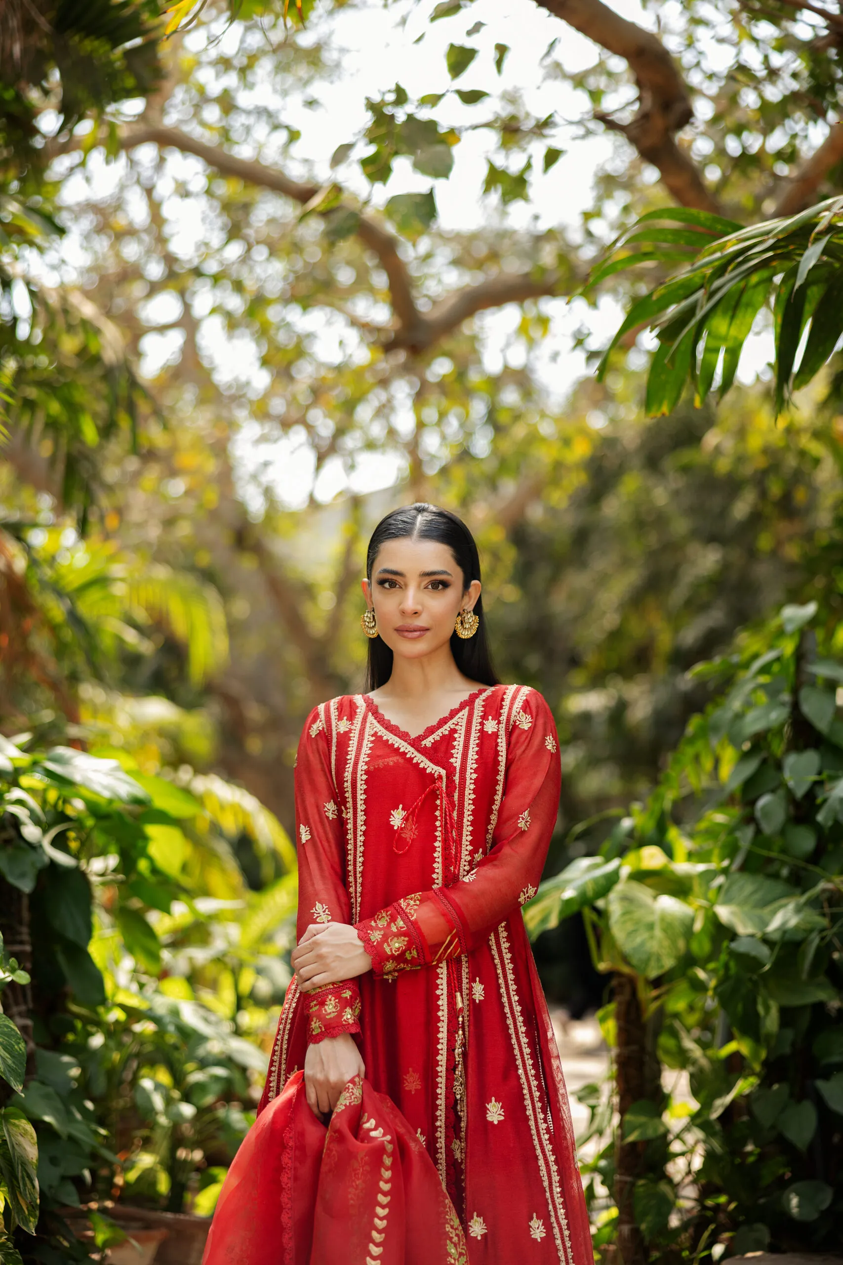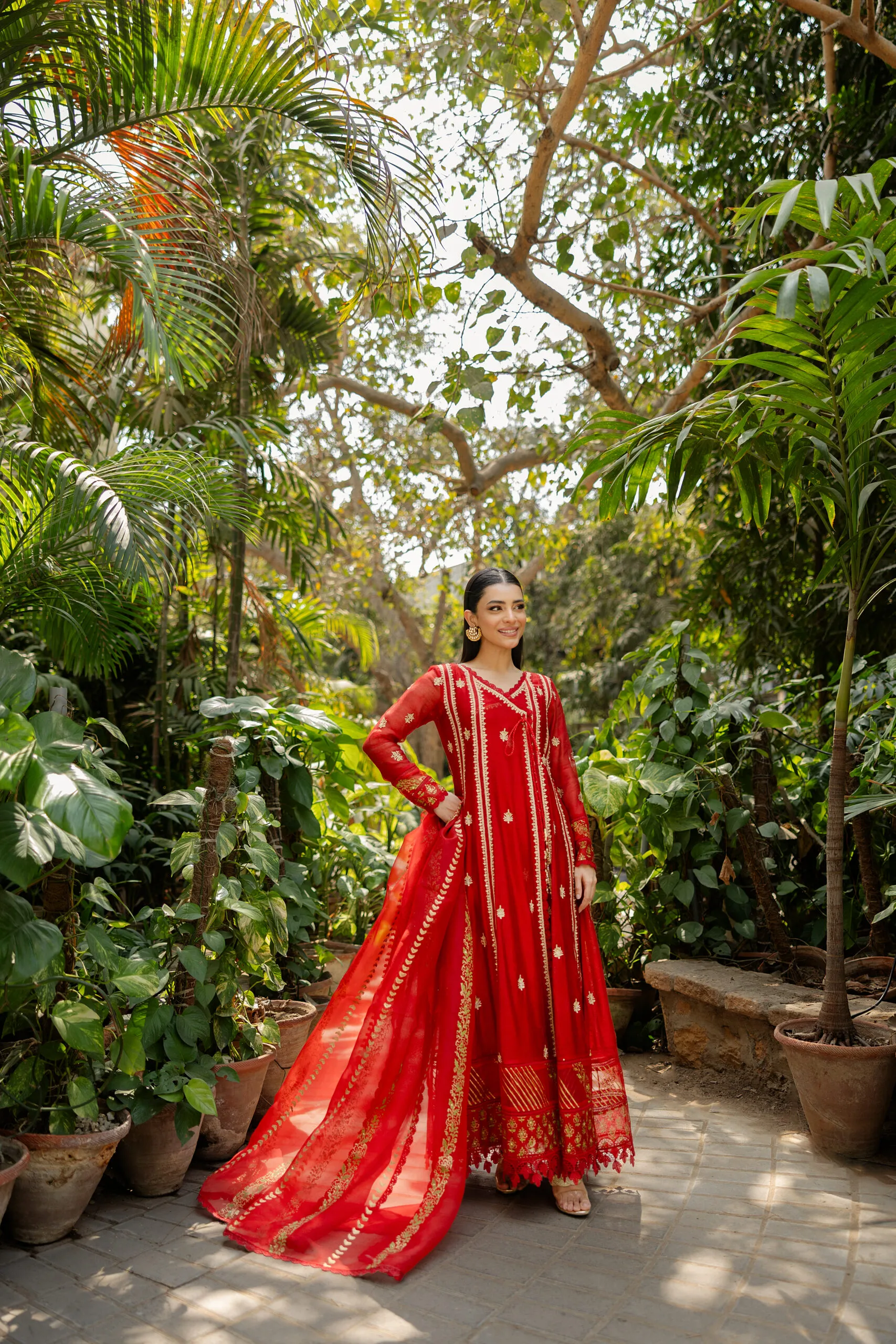 Red Anrakha khaddi net done with laces Ari work hand touching & block print